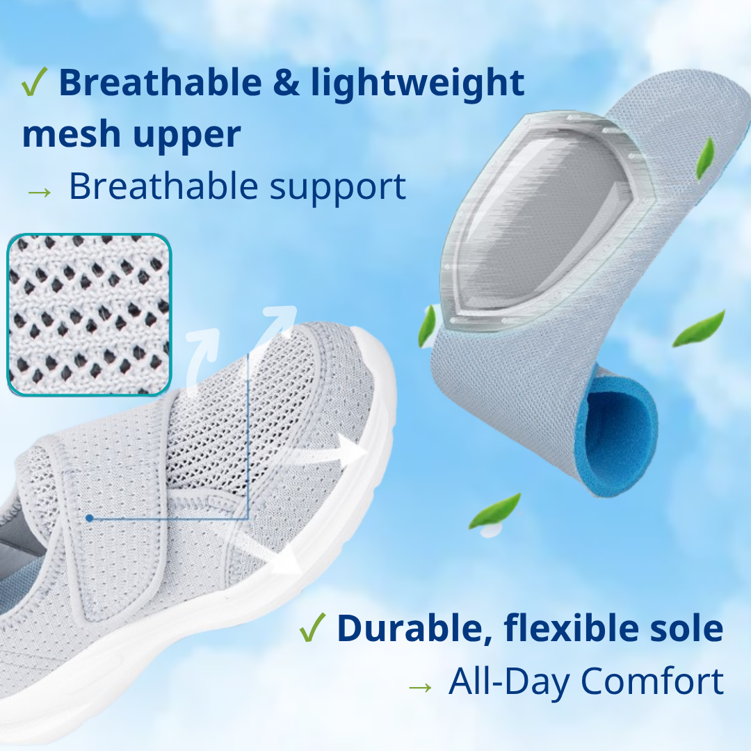 No more sore arches or sweaty feet. The lightweight, breathable mesh upper keeps your feet cool and dry — while the soft, seamless interior prevents irritation and hot spots. A flexible sole cushions every step and reduces pressure on heels and joints, making it easier to walk longer, with less pain.